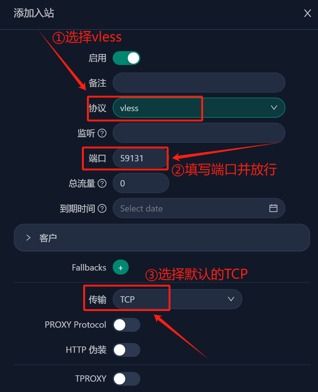 1、点击左边【入站列表】,然后【添加入站】,传输方式保持【TCP】不变,尽量选择主流的vless+reality+vision协议组合,