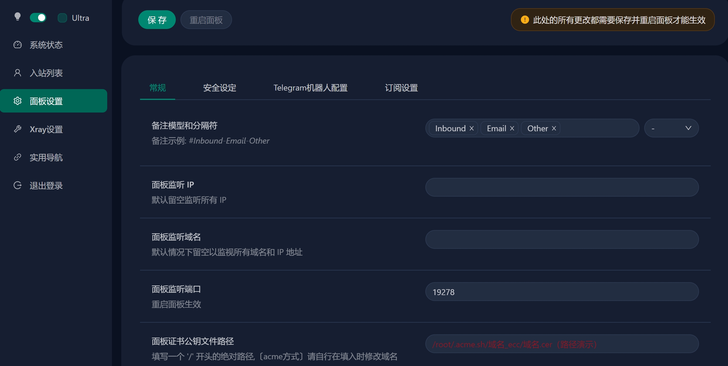 • 输入您的面板并配置 Telegram 机器人设置,如下所示: 面板设置